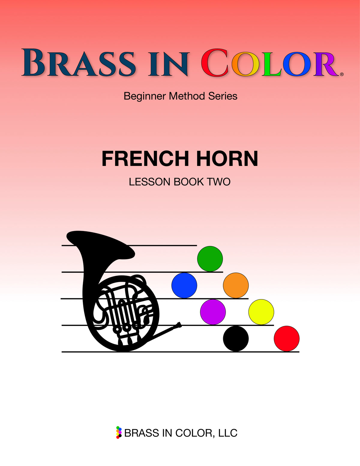 French Horn Book Two of the Brass in Color Beginner Method Series uses a color-coded tablature (Color Fingerings) to help students learn the fingerings of the French horn and apply them to notes in the Low Range.