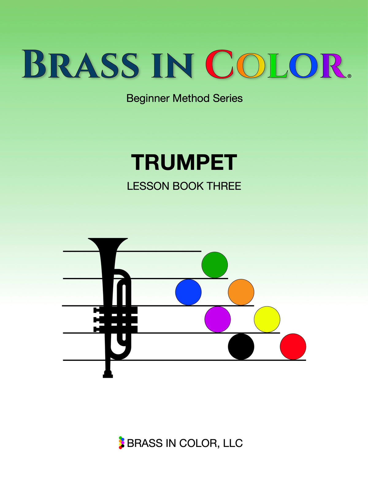 Trumpet Book Three of the Brass in Color Beginner Method Series uses a color-coded tablature (Color Fingerings) to help students learn the fingerings of the trumpet and apply them to notes in the High Range.