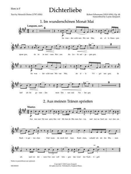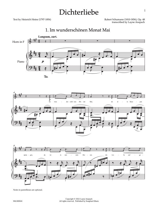 Divided into five sections, Heine’s Book of Songs dealt with issues of unrequited love, romanticism, and introspection, and it was from the more than 60 poems of the lyrical cycle Lyrisches Intermezzo (Lyrical Intermezzo) that Schumann found inspiration for his noteworthy song cycle, selecting 16 of Heine’s lyric poems for his Dichterliebe.