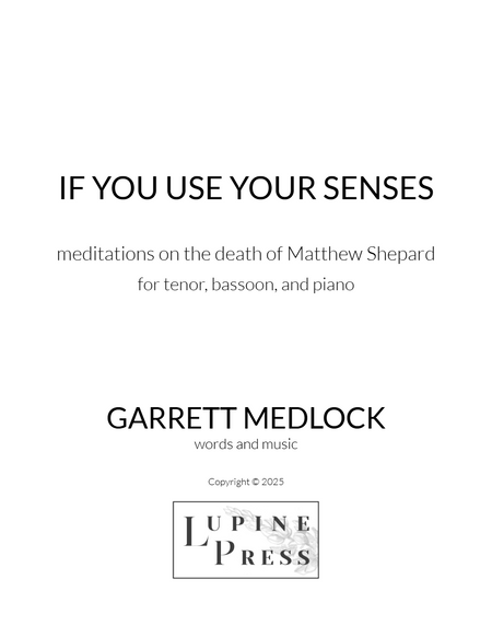 If You Use Your Senses is a song cycle for tenor, bassoon, and piano that is inspired by a sensory imagining of Matthew Shepard’s final moments. The piece is structured as a set of meditations on where and how Matthew Shepard was left to die and how it might feel to experience death the way he did — as a gradual removal of the senses, a falling away of the consciousness. Honing in on each of the senses as they fail brings into focus sensations, memories, dreams, yearnings, and pain. Written as a cathartic panacea to commemorate the 25th anniversary of Matthew Shepard's death, this piece offers a space for reflection on the nature of life and death, the power of love and hatred, and the sometimes tenuous bonds between us and our world.