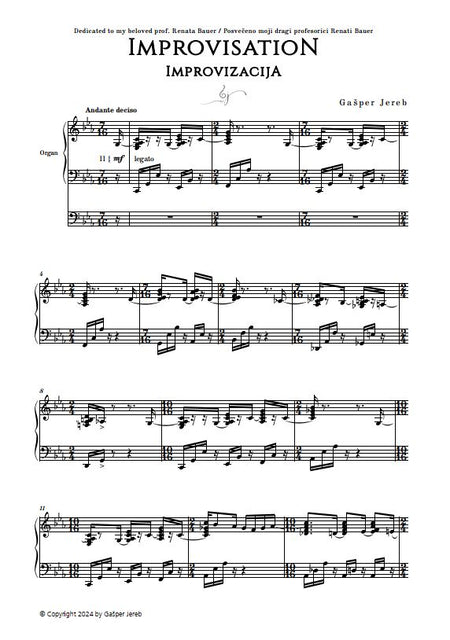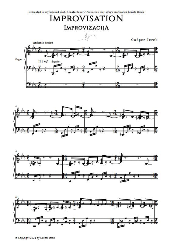 Improvisation for the organ is based on an introductory theme characterized by rhythmic complexity, which predominates over melodic qualities. In the piece's middle section, new sound material appears, which, through a creative combination with motifs from the introductory theme, gradually leads to virtuosity in the concluding section. The piece Improvisation is dedicated to Ms. Renata Bauer, my organ professor at the Academy of Music in Ljubljana.