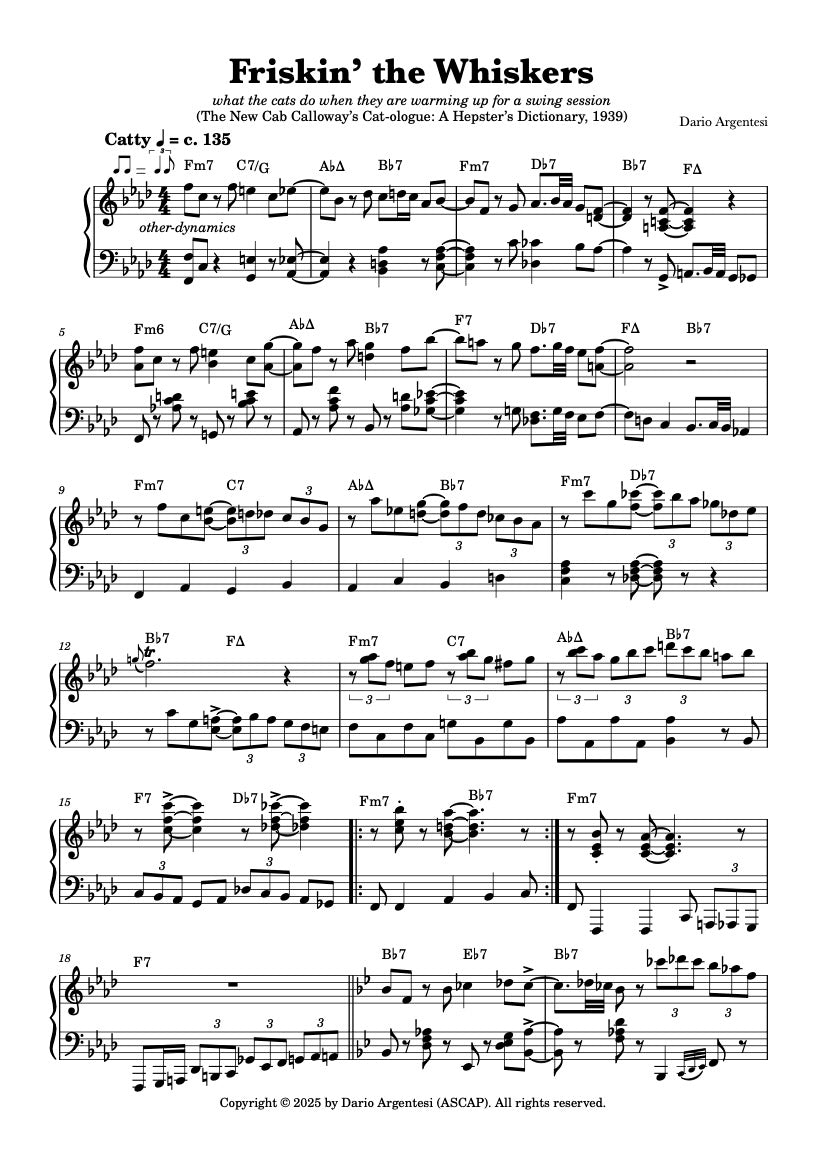 A suite of five pieces for harpsichord, in the jazz idiom. Chord symbols above the stave enable improvisation.
