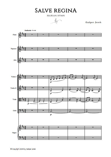 The piece Salve Regina is scored for flute, string quartet, organ, and preferably boys' (or female) choir. It is structured as a setting of the Marian antiphon, combining the timbral richness of the ensemble with the ethereal qualities of the choir. The composition explores harmonic colour and contrapuntal textures, highlighting the interplay between instrumental and vocal elements while maintaining clarity and balance in its liturgical character. The composition is divided into five short parts.