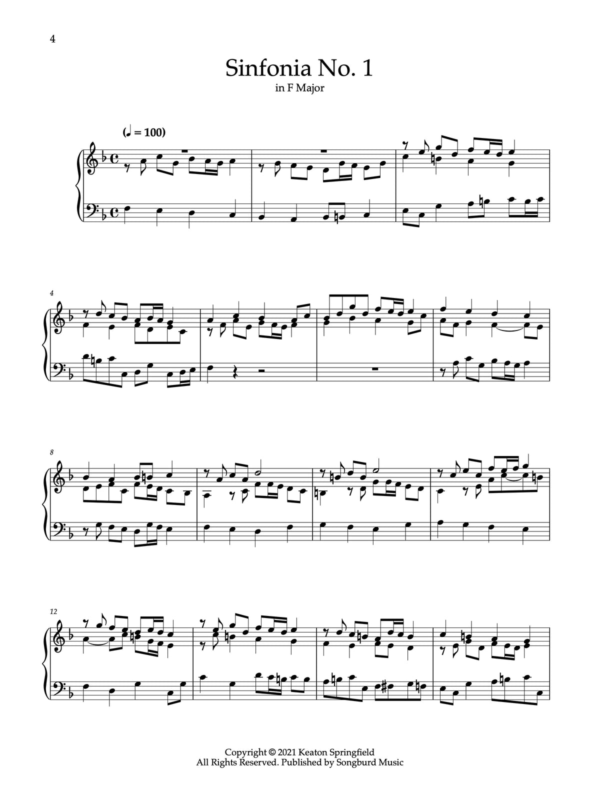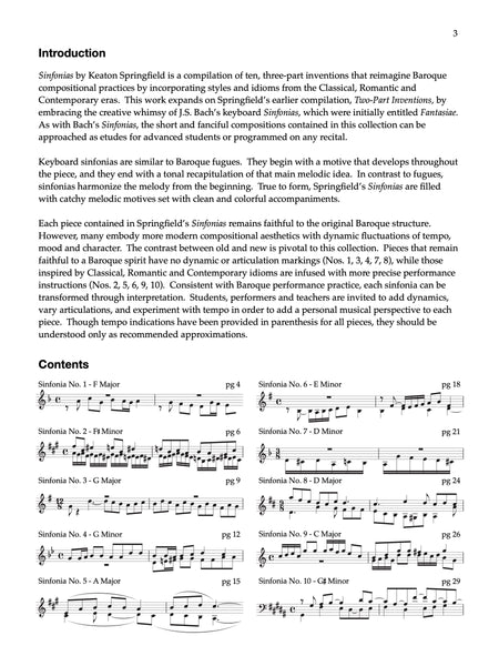 Sinfonias by Keaton Springfield is a compilation of ten, three-part inventions that reimagine Baroque compositional practices by incorporating styles and idioms from the Classical, Romantic and Contemporary eras. This work expands on Springfield’s earlier compilation, Two-Part Inventions, by embracing the creative whimsy of J.S. Bach’s keyboard Sinfonias, which were initially entitled Fantasiae. As with Bach’s Sinfonias, the short and fanciful compositions contained in this collection can be approached as etudes for advanced students or programmed on any recital.