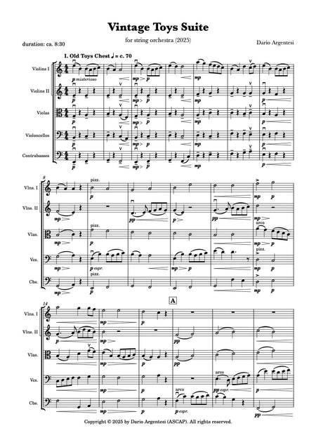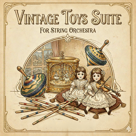 A suite for youth string orchestra. Ushered in by a slow, mysterious introduction (Old Toys Chest), the movements are named after a particular toy: Porcelain Doll is inspired by 18th century minuets; Jackstraws, believed to have developed in ancient China, presents features normally associated with Asian music, entirely in pizzicato; Carousel is a slow and melancholic meditation; Spinning Tops is the fast grand finale.