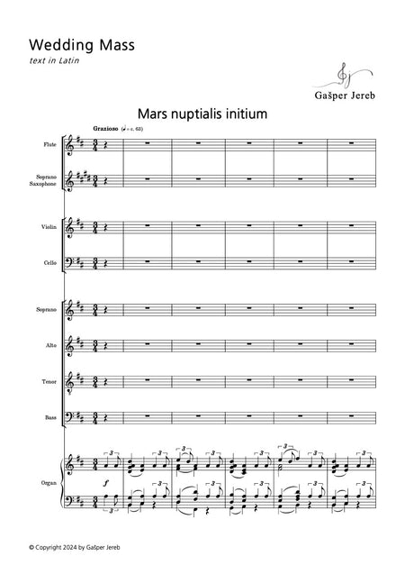 "Wedding Mass" by Slovenian composer Gašper Jereb stands out as an example of sacred music that merges traditional liturgical elements with contemporary instrumentation and personal significance. Composed in 2016 for Jereb's own wedding, the piece is a deeply intimate and celebratory work that reflects both the sanctity of the occasion and the composer's artistic voice.