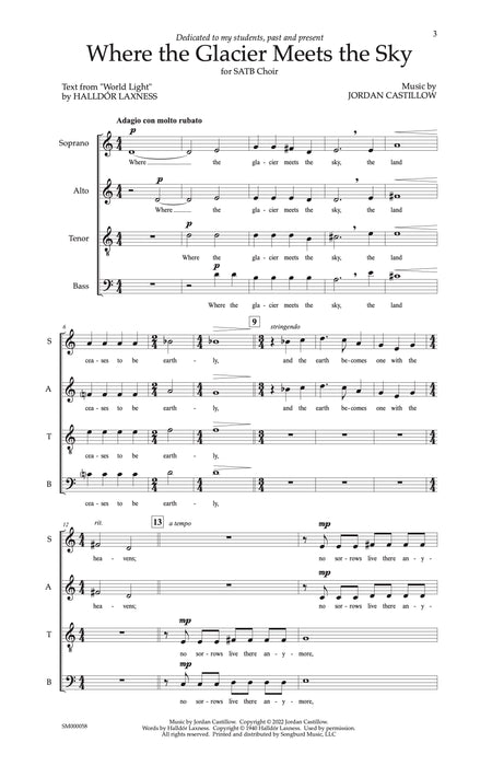 Where the Glacier Meets the Sky is a moving and sentimental choral piece that draws its musical inspiration from a famous poetic line found in the literary epic, Heimsljós (World Light), written by the Nobel Prize laureate of Iceland, Halldór Laxness. This once controversial novel tells the story of Ólafur Kárason, an orphan boy who longed to read all the books in the world, and aspire to write his own poetry amidst an atmosphere of socialism and communism, while plodding through his personal struggles and forging his creativity in the ruggedly beautiful landscape and indomitable culture of Iceland.